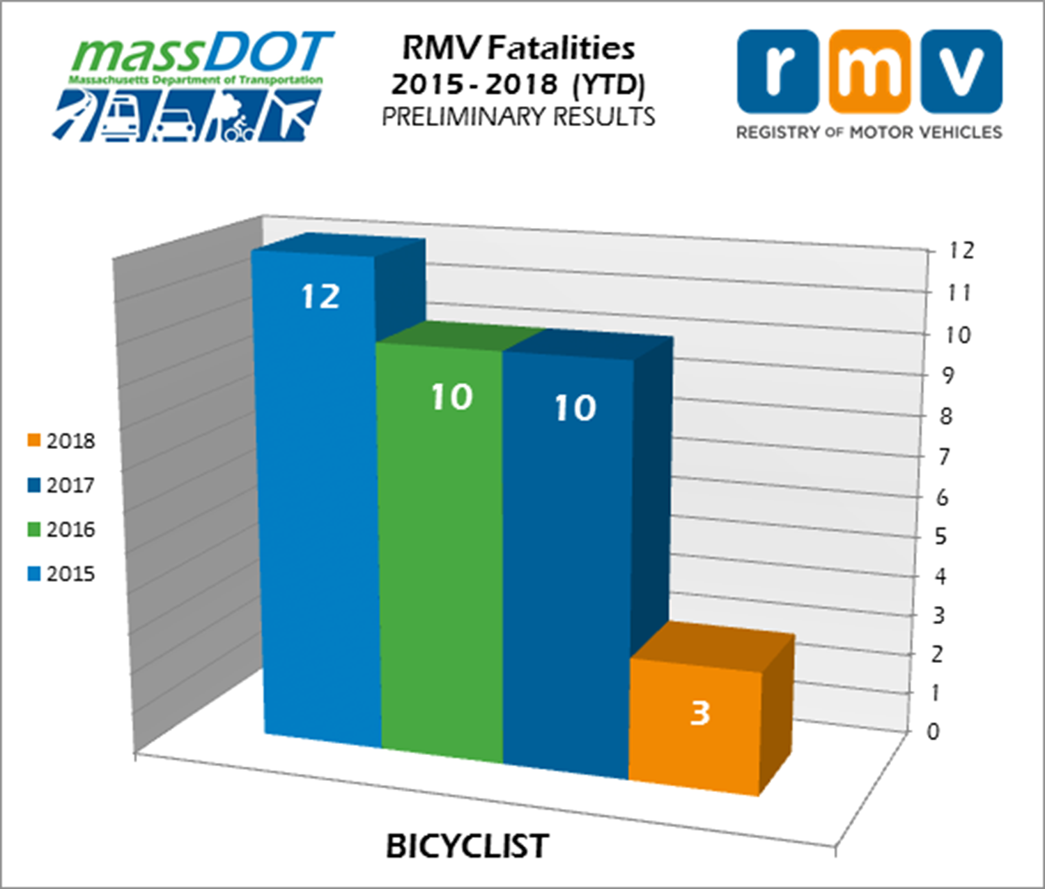 There is hope that Boston will have fewer and fewer ghost bikes in coming years, and evidence that the measures already implementing area improving cyclist safety, as the image below indicates. [Note: MassBike points out that the 2018 3 fatalities excludes private areas, and that two were left off for that reason.]