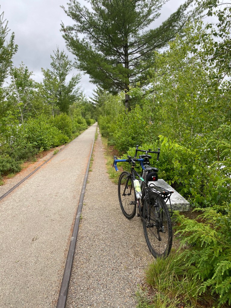 Monday we awoke to only some light rain! Thrilled at our good fortune, we hit the road to a nearby rail trail in Wolfeboro, NH. 12 miles each way, it’s a packed dirt trail that was perfect for our cyclocross bikes with wider treaded tires (wouldn’t have been as fun on a full road bike).