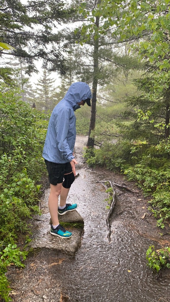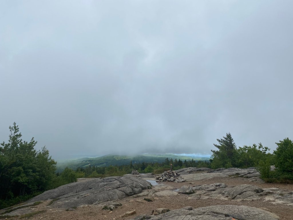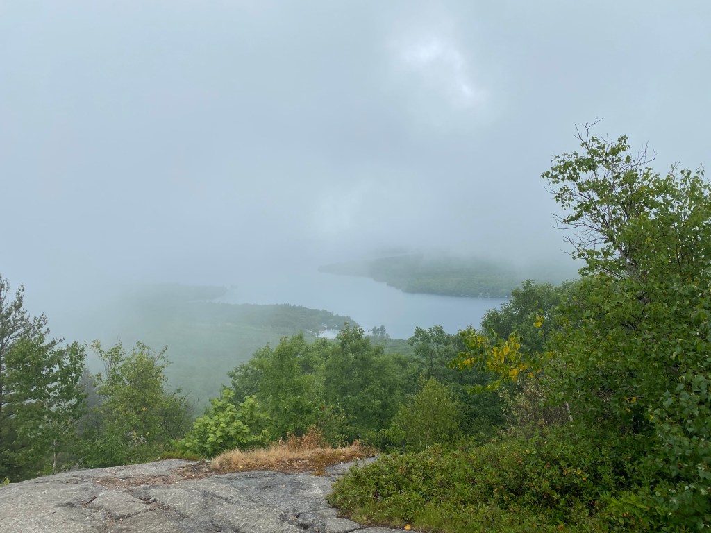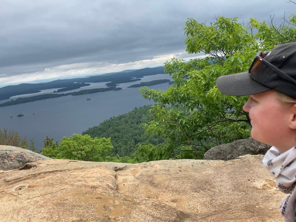 Still.Raining. But finally time to embrace Mount Major, rain or shine. Fortunately, most of the way up we are able to avoid the rain. It’s a short hike by miles, but nearly straight up at the end. My favorite hikes are those with crawling on rock faces and turning around to see breathtaking views! As I straighten out to stand up at what I think is near the top (spoiler: it wasn’t!), I sigh with relief that the rocks aren’t wet and slippery (yet) as I take in the view of the lake.
