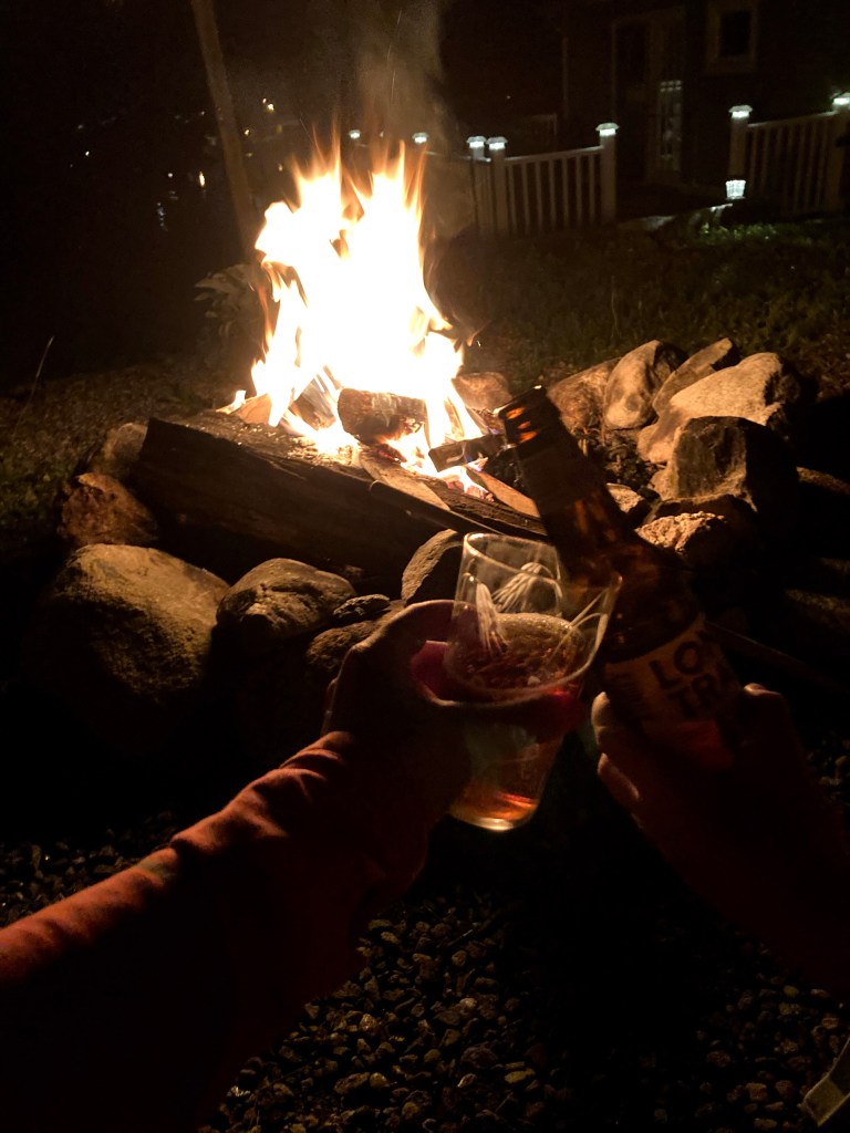 Days 4 and 5 we are back “at work,” working remotely from the cabin while enjoying the view from the lake. Of course, it’s still raining, but in the evening we’re able to put our skills to the test and manage to light a fire with the wet wood, and get it hot enough to stay lit once the drizzle starts again. The fire pit was a huge perk of our stay in NH, especially since we had not been able to go camping yet due to covid, and, though we love rain, being unable to have a fire the first few nights bummed us out! We made up for it with three nights of huge fires.