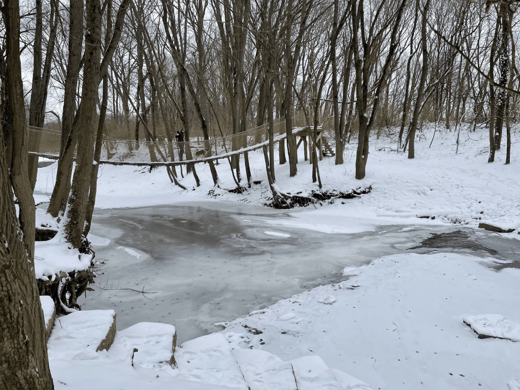 For a longer hike, you can continue on the Overlook Trail past the Lodge, which offers a nice wooded section of the trail, complete with a rope bridge that our dog is very frightened of (warning: it does get slipper when wet). Past the rope bridge is a very long loop trail (Mingo Trail) through meadows and woods, which we particularly enjoy after a good snowfall.
